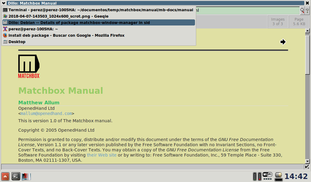 Naturalmente Matchbox parece simple y básico como un sonajero, y además se inicia con rapidez. Ventanas maximizadas, en efecto, y el panel y la decoración que añade el gestor ocupan sólo un poco del valioso espacio de la pantallita del portátil. Para saltar de una ventana a otra puedo recurrir al menú de tareas que aparece al clicar sobre los títulos. Es incómodo, como incómodo es todo lo que deba manejarse con un touchpad... De todas formas apenas uso este ordenador para leer de vez en cuando en Internet, y por lo tanto sólo acostumbro a abrir una terminal y un navegador: no espero pues tener que pelear demasiado con ese menú.