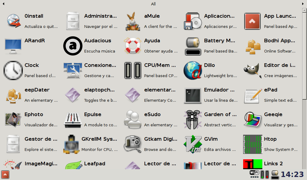 —eso abarca casi cualquier cosa moderna, vaya—, aparecerán en listas de grandes iconos, clasificados por categorías: «Red», «Oficina», «Juegos», etc. En una sesión de trabajo normal este escritorio resulta accesible desde el menú de tareas del gestor.