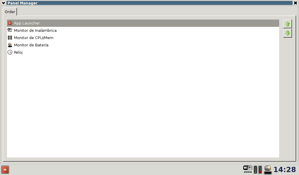 Este cuadro de diálogo permite ajustar el orden de los accesorios del panel. Por lo demás la configuración del gestor sigue la tradición de Unix: archivos de texto ocultos, editados a mano.