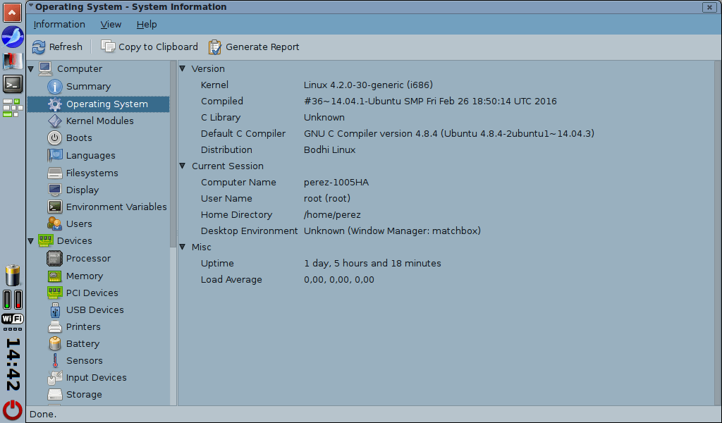 El panel (Matchbox-panel) y el escritorio (Matchbox-desktop) son en realidad piezas independientes y no resultan imprescindibles, pero en mi opinión sí muy convenientes. He de señalar que algunos accesorios del panel —el indicador de batería y el de redes wifi— están anticuados y no funcionarán correctamente en Linux modernos, debido a los cambios ocurridos en los árboles virtuales de archivos /proc y /sys, que el sistema utiliza para dar información de diagnóstico.