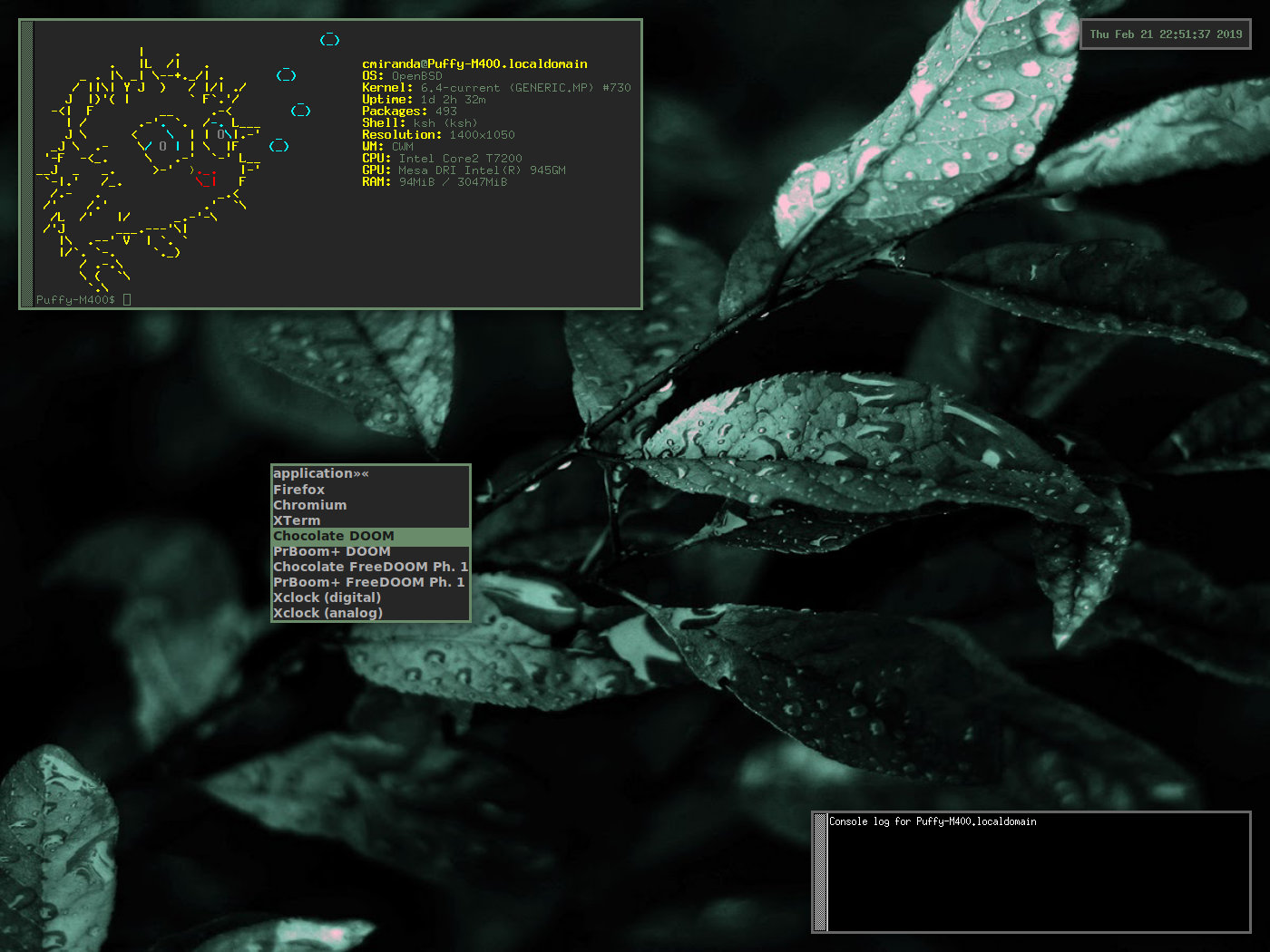 Y de vuelta al mundo actual... Cwm en su hábitat originario, OpenBSD, en un bonito escritorio verde. Hay un menú que permite cargar Doom y otras aplicaciones menos relevantes. (La captura no es mía: fuente |