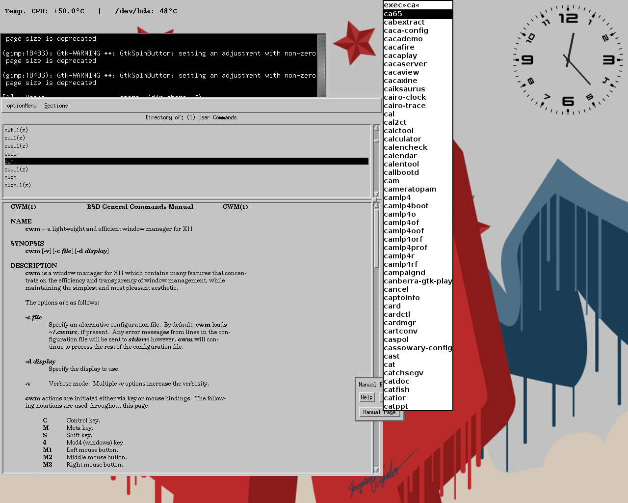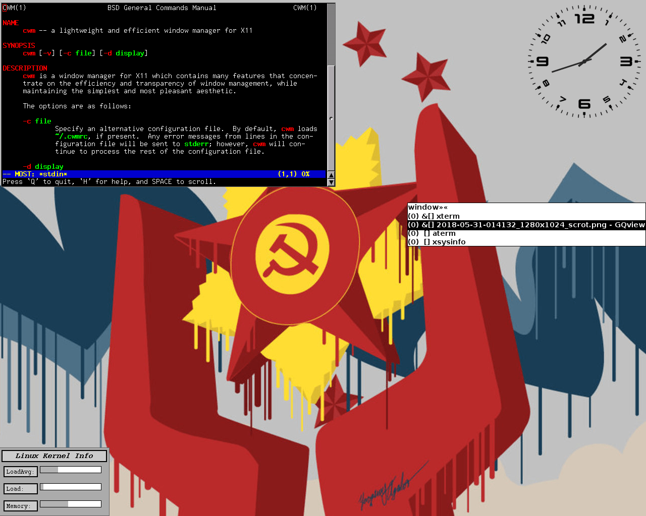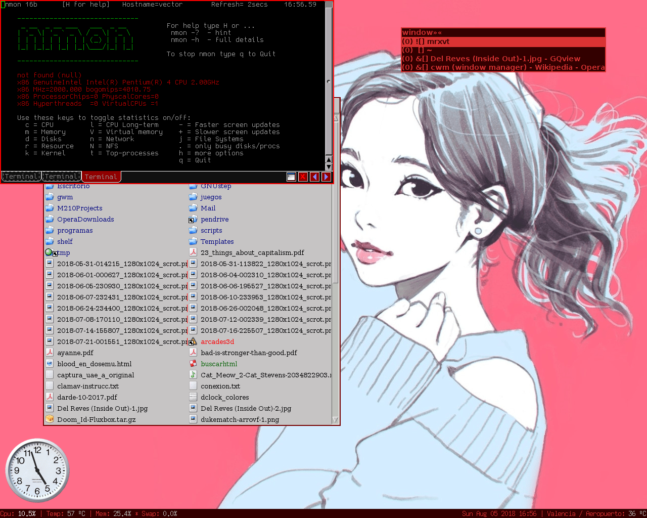 Y aquí nos metemos ya en el mundo de los experimentos extraños: si quieres volver a los años ochenta, Cwm puede acompañarte. Unas pocas terminales, un reloj —Xclock, probablemente—, y Conky en el borde inferior. (La captura no es mía: fuente |