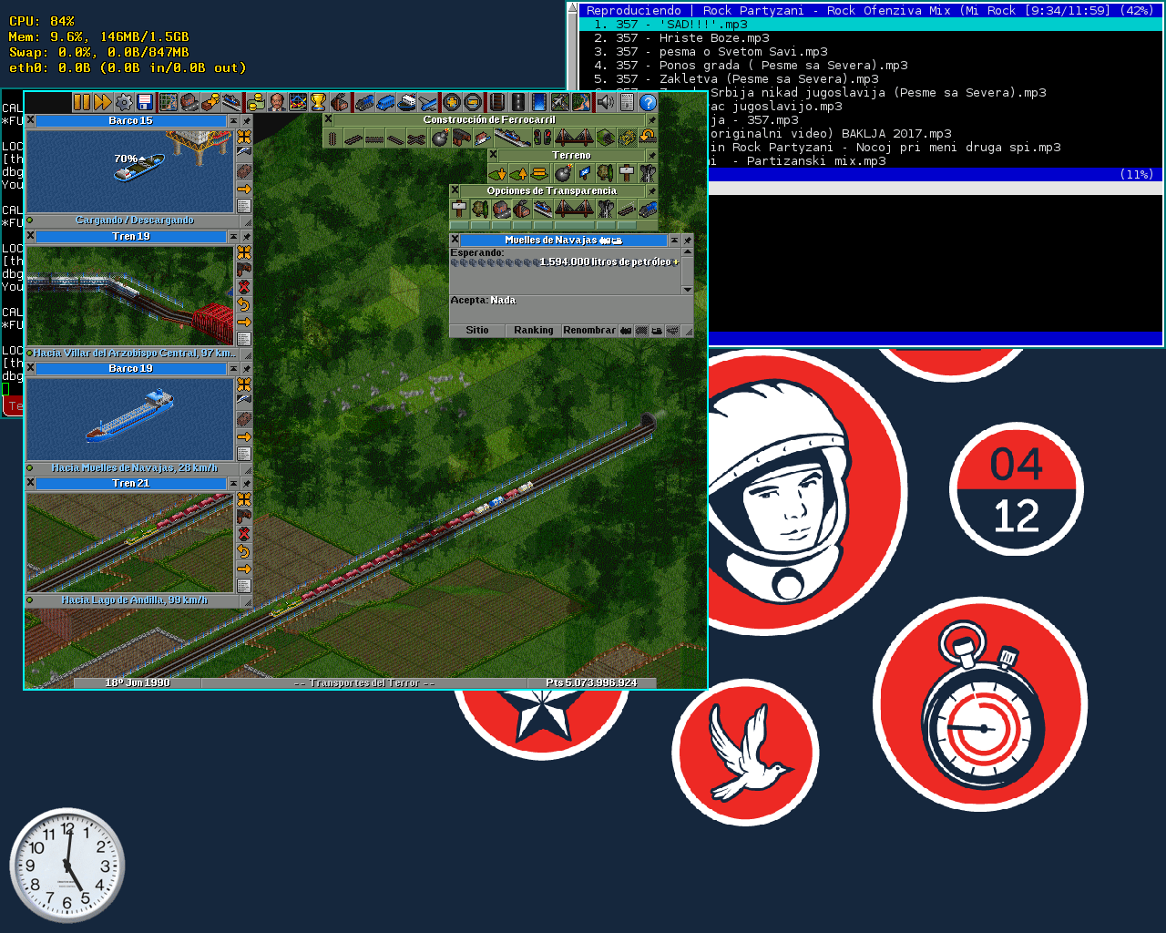 Fondo de escritorio conmemorando a Yuri Gagarin. También una partida a OpenTTD, ese juego en el que puedes construir tu monopolio del transporte. Y OSD Monitors para mostrar, arriba, información sobre el sistema.