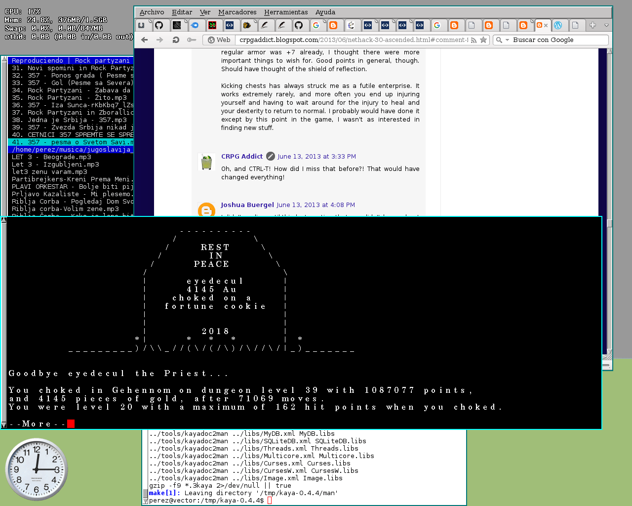 Cwm sólo decora las ventanas con un discreto borde, cuyos colores y grosor pueden modificarse. En primer plano, un personaje muy prometedor de Nethack encuentra una muerte totalmente ridícula. |