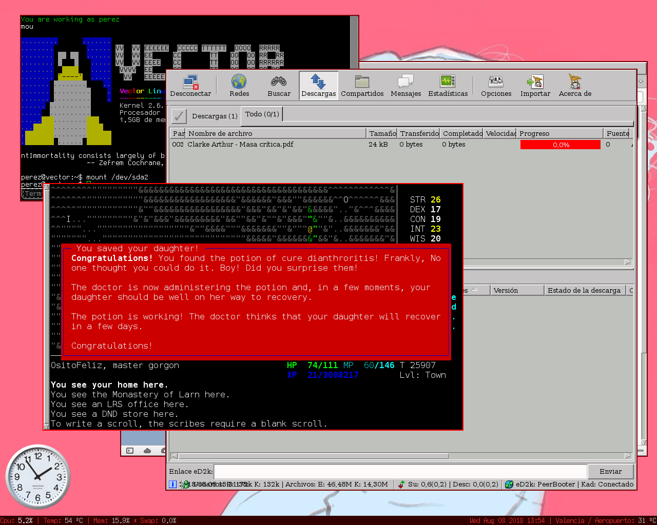 ¿Más cosas? Francamente no se me ocurren. He convivido con Cwm más de dos meses y, pasada la primera semana, se ha convertido en un entorno gráfico que utilizo de carrerilla y sin pensar. Y de eso se trata. El único cambio que he hecho en mis hábitos ha consistido en descartar Aterm por Mrxvt; mayormente porque esta alternativa cuenta con una interfaz de pestañas, lo cual conlleva menos ventanas dispersas de las que acordarse, y eso hace más cómoda tu existencia en un gestor sin escritorios virtuales.