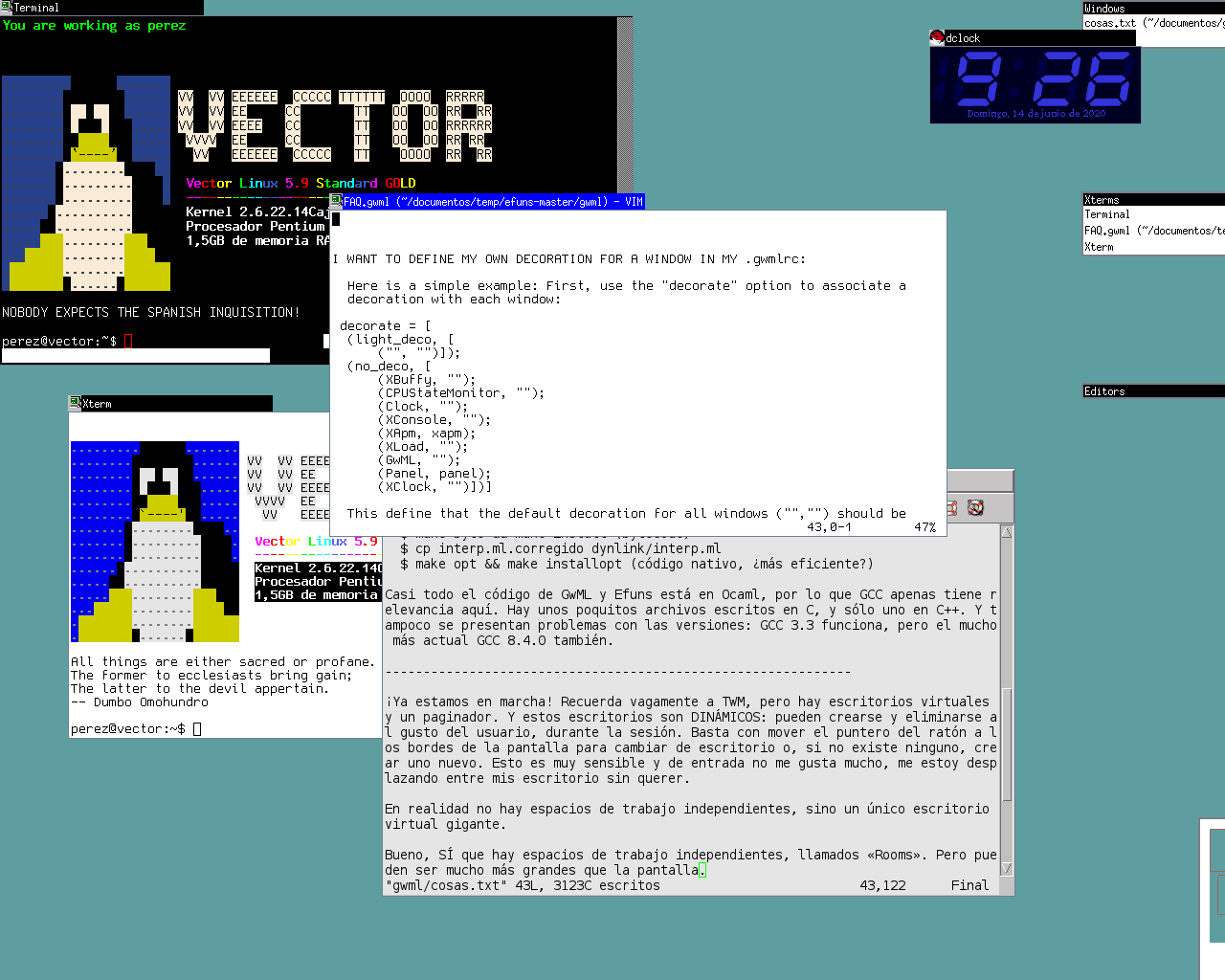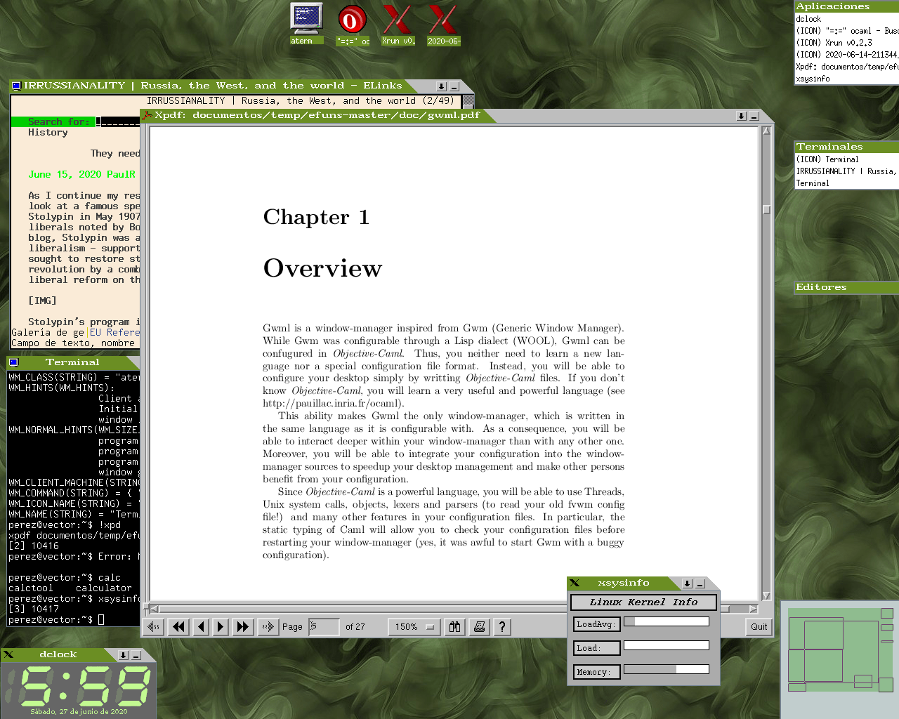 Ya he comentado que la configuración por defecto luce un aspecto más bien austero. Se trata de una apariencia engañosa, porque GwML ofrece mucha funcionalidad que como mínimo resulta accesible desde los menús. Al usuario se le permite minimizar ventanas como iconos, o si lo prefiere enrollarlas; ampliarlas a pantalla completa, o sólo en sus dimensiones vertical u horizontal; consultar información sobre ellas —geometría, atributos relativos al X Window System, etc—; seleccionar una decoración diferente... Luego, desde el menú general que aparece al clicar sobre el escritorio, es posible cambiar algunos aspectos del funcionamiento del gestor o manejar los escritorios virtuales, entre otras cosas.