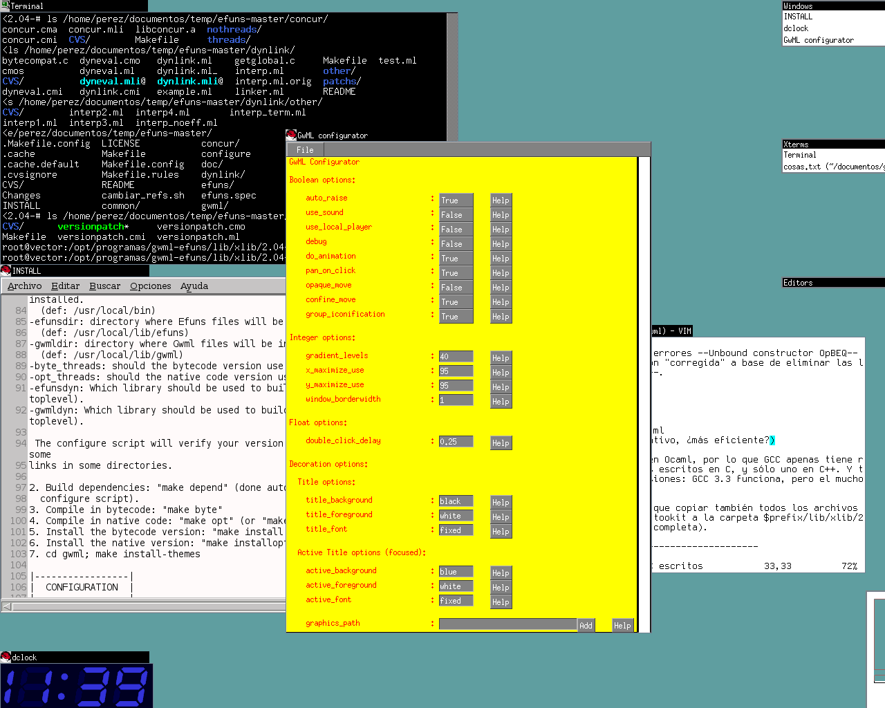 Y ahora GwML imitando a AfterStep, en un escritorio con una estética muy de los años noventa. También puede verse en acción al editor Efuns. |