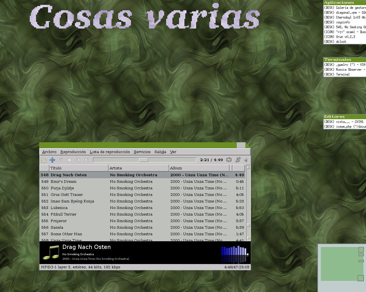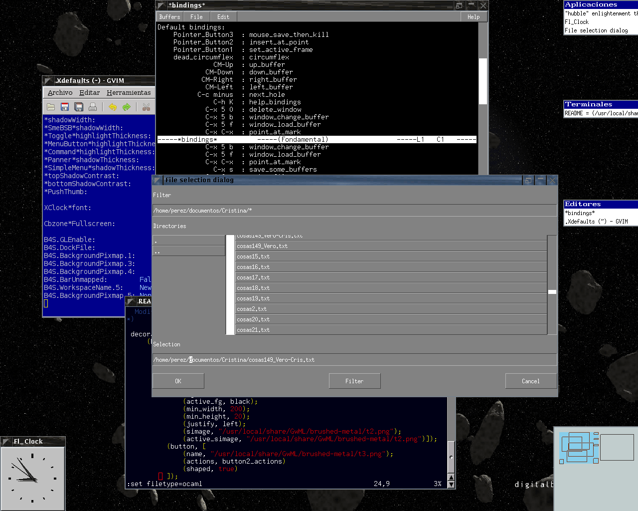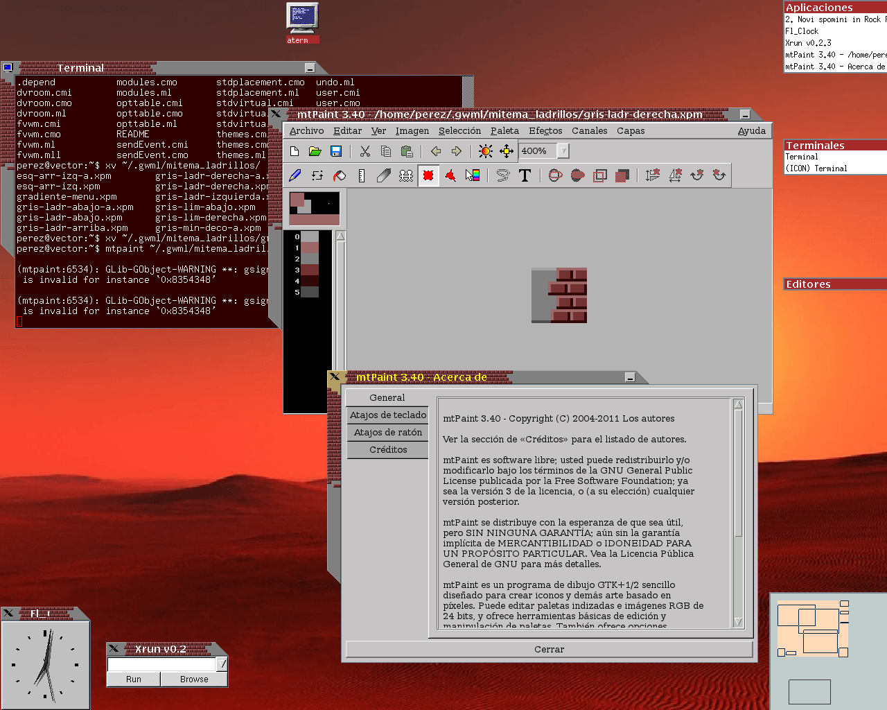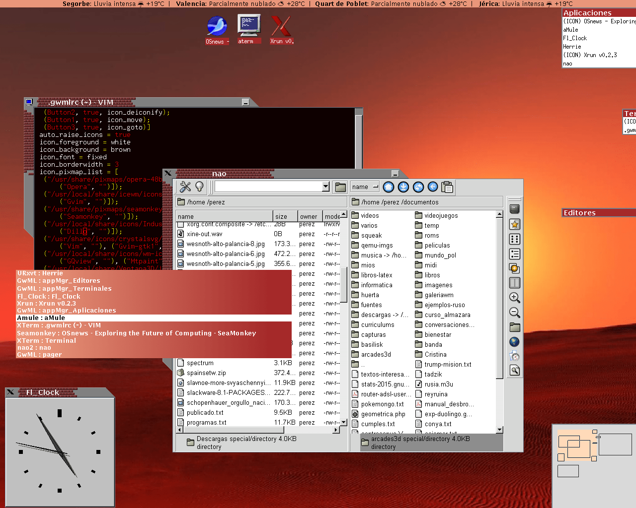 Puestos a experimentar con el editor gráfico y diseñar mis propios temas para GwML, se me ocurrió esto... Creo que demuestra la flexibilidad del gestor. Ya de paso, es posible asignar decoraciones diferentes a distintas aplicaciones, como se aprecia en las ventanas del reloj y Xrun |