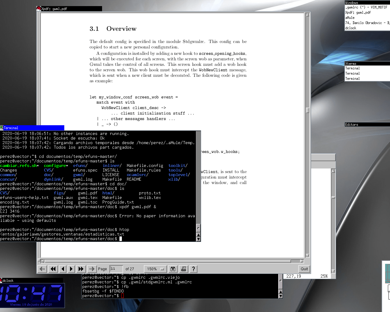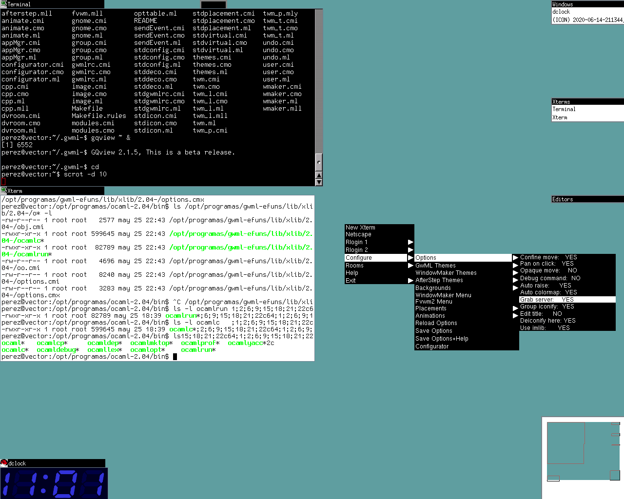 Mi sensación de triunfo, sin embargo, no duró demasiado. La configuración por defecto de GwML adolece de algún fallo: el menú de operaciones de ventana se desplegaba correctamente, pero la mayor parte de sus opciones no funcionaba. Sorprendido, decidí abrir el capó y examinar lo que hay dentro, para intentar localizar ese error. Y en este caso «dentro» significa el directorio ~/.gwml-, que contiene la mayor parte del código Ocaml del gestor. Se halla repartido en cerca de una treintena de ficheros —stdconfig.ml, stdgwmlrc.ml, user.ml, etc—, y se espera que el usuario los lea y modifique si lo necesita. Yo fui pasando de uno a otro, ojeándolos sin mucho criterio y cada vez más perplejo. Ocaml me resultaba poco familiar y, además, ¿dónde meter las zarpas? Sin conocer un poquito del código y la organización interna de GwML iba ser imposible tocar nada.