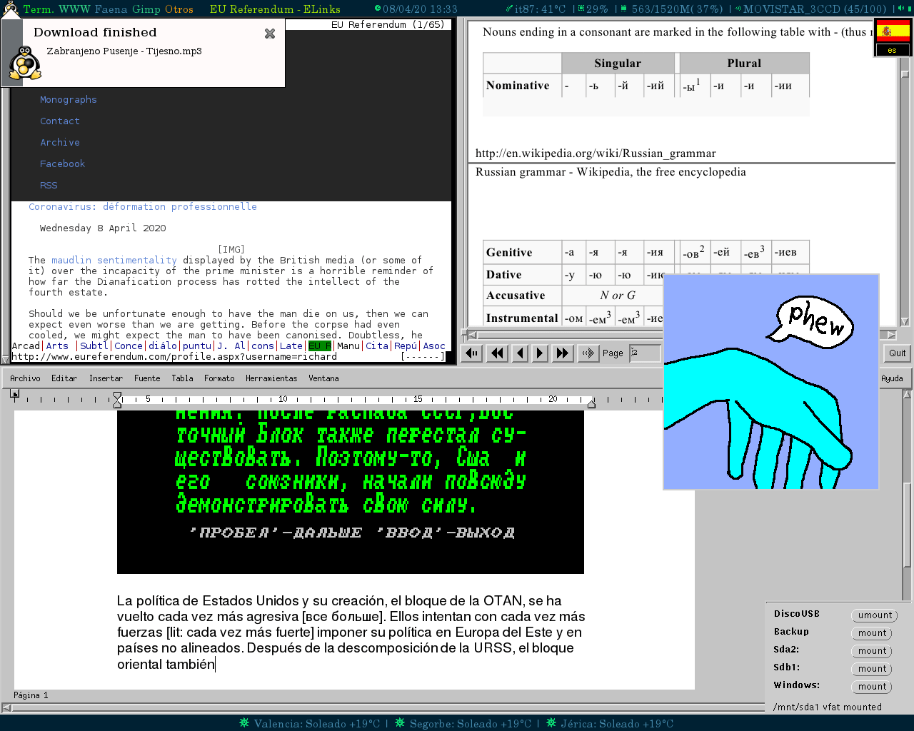 Queda material por subir. De momento añado artículos dedicados a Mcwm, Monsterwm, Rio —este gestor me gustó bastante, es muy parecido a 9wm—, y un proyecto largo tiempo abandonado pero curioso, Wwm. En un futuro continuaré con más, hasta que todo lo que preparé esté en línea. Aunque realmente ya no queda tanto.