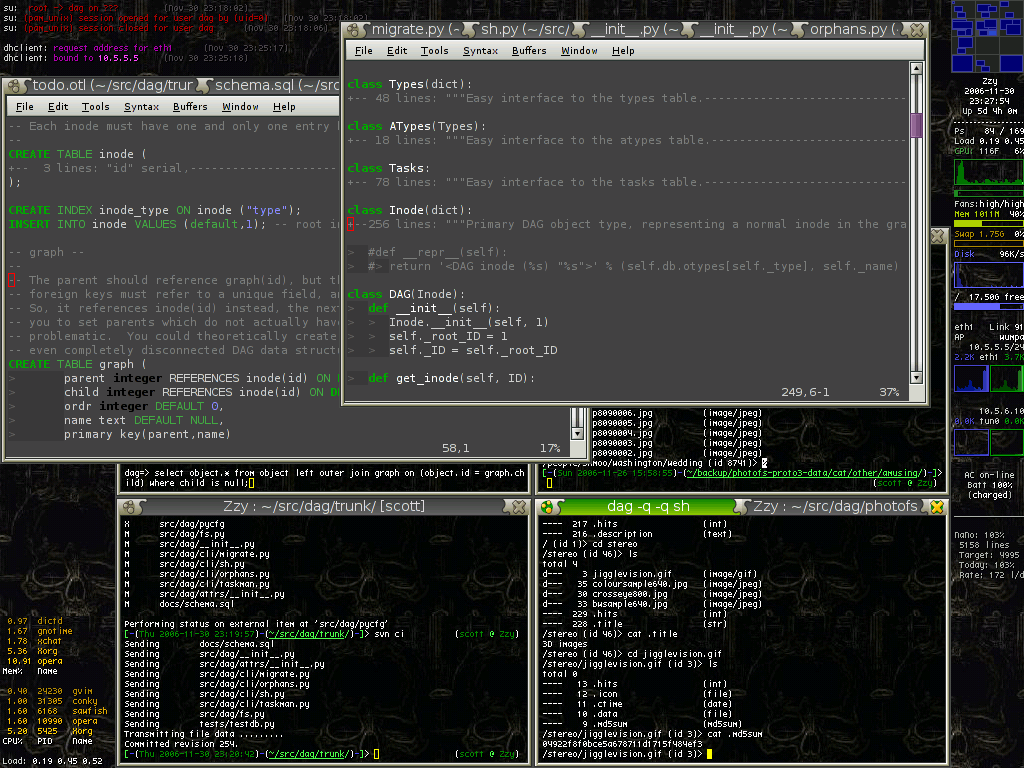 Sawfish 1.3.3 allá por el año 2006, con varias terminales ordenadas en mosaico y dos instancias de Vim visibles sobre ellas. Otro detalle destacable es que hay abiertas muchas más ventanas de las que se distinguen al primer vistazo porque se hallan agrupadas en pestañas. (La captura no es mía: fuente |
