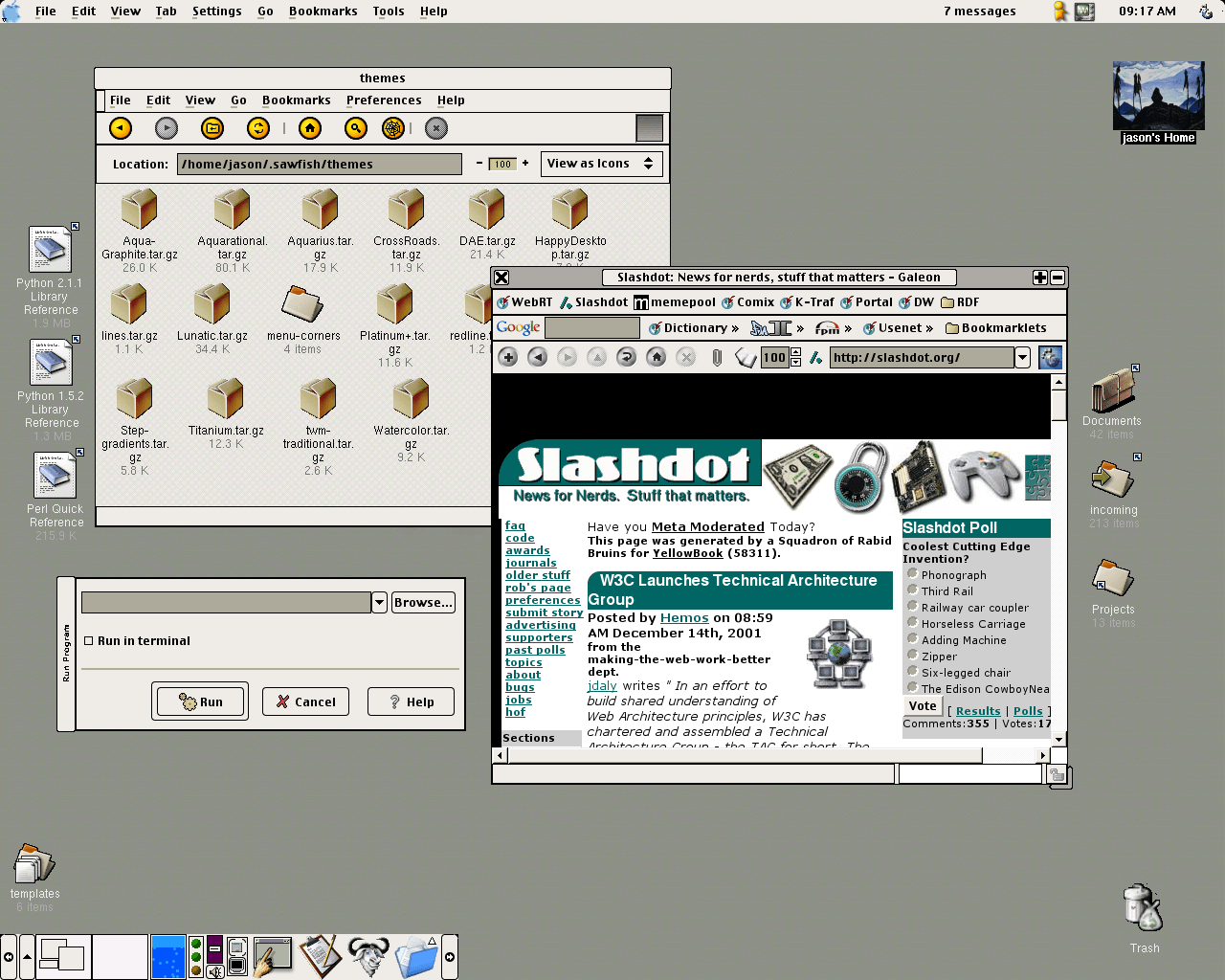 Por lo demás, usar Sawfish es... Bueno, en realidad depende del tema escogido. Porque éstos no sólo cambian la estética, también los controles de cada ventana y sus respectivas funciones. Así que por un lado tenemos el mencionado «StyleTab» y sus doce botoncitos, en plan salpicadero del Coche Fantástico; mientras que por otro resulta posible encontrar una imitación de la humilde interfaz de Twm llamada «Twm-traditional», con sólo un menú y un control para modificar el tamaño de cada ventana. Entre ellos existe un amplio surtido de unos cuatrocientos cincuenta temas, un número muy respetable incluso considerando que muchos son variaciones de otros.