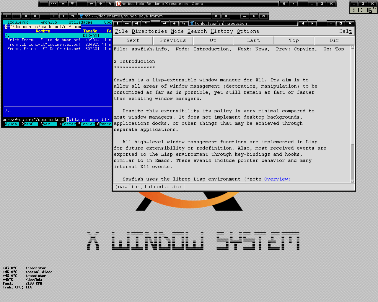 Sawfish usando el tema «StyleTab», que destaca por su aglomeración de controles en los títulos de las ventanas, y su decoración negra con reflejos. Estoy leyendo la documentación mediante tkInfo. El reloj de la esquina es Mdgclock.