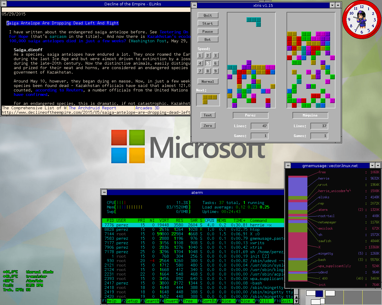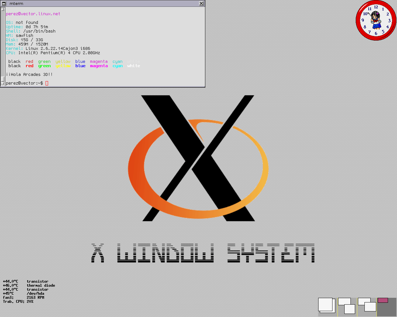 Porque puedes usar algo tan sofisticado como Sawfish para crear un escritorio tan soso como éste. Lo que me pedía el cuerpo entonces, vaya. El fondo fue un invento mío. Abajo hay un pager (Netwmpager), y arriba un reloj (Emiclock