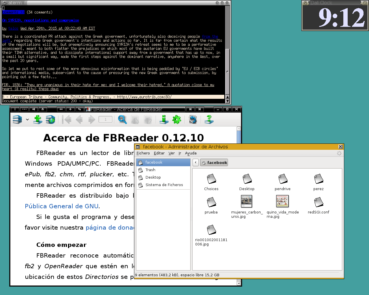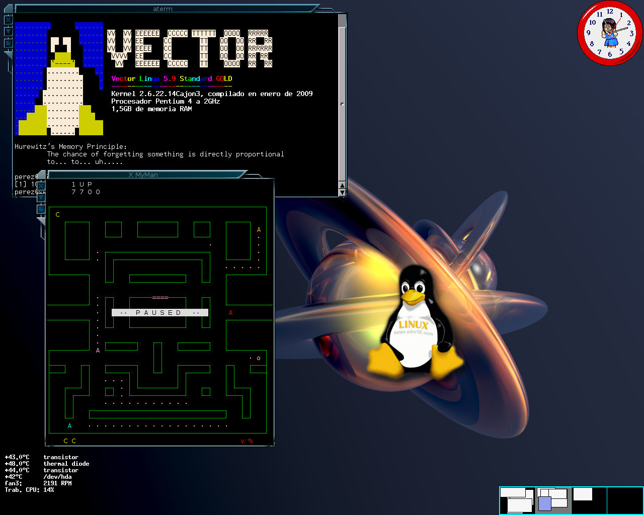 y resulta por ello fácil complementarlo con otros accesorios. Lo más socorrido son paneles y barras de tareas: Fbpanel corre aquí estupendamente, por ejemplo. La comunidad de Sawfish desarrollaba de forma paralela un paginador (SawfishPager), que yo probé sin éxito; de modo que al final me decanté por Netwmpager. En fin, abundan las opciones.