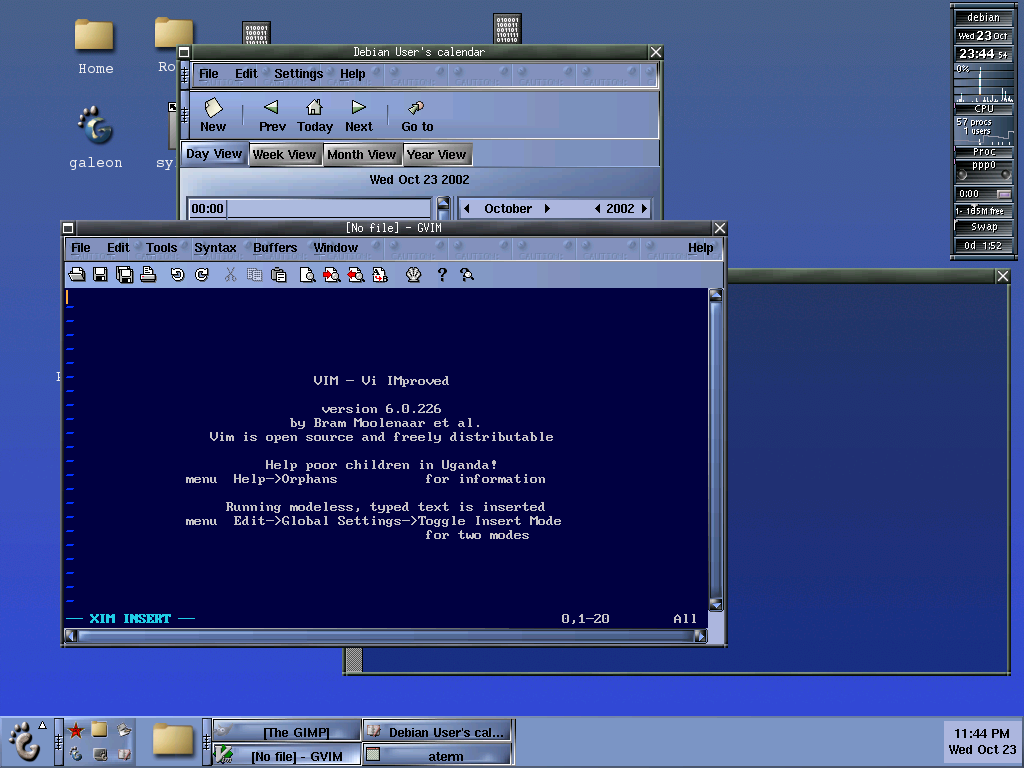 Esta otra imagen es de 2002, y muestra un escritorio construido con Sawfish, el panel de Gnome 1.4 y ROX Filer —probablemente para mostrar los iconos—. (La captura no es mía: fuente |