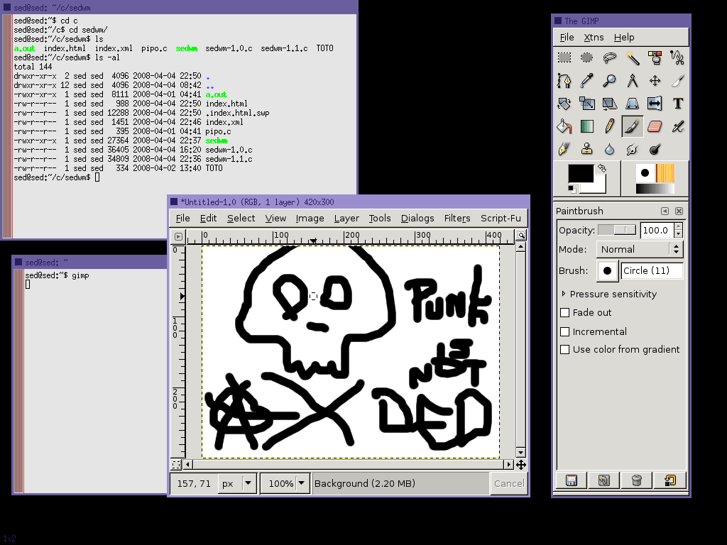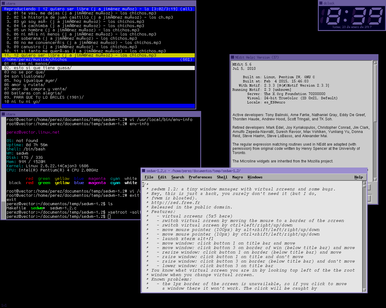 ... Eso, el código de la última versión publicada por el autor en 2008, y también ficheros ejecutables compilados por mí (Glibc 2.5, GCC 4.6.4). El archivo sedwm-1.2-mod.c es una copia del original, con los cambios superficiales que hice para adaptar SedWM a mis manías: colores distintos para la interfaz, eliminada la capa de color negro para el fondo del escritorio, y la posibilidad de cambiar el tipo de letra usada en los títulos de las ventanas.