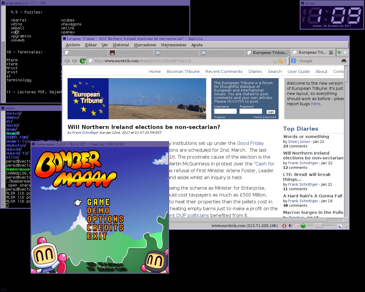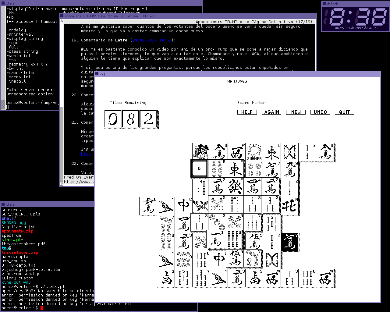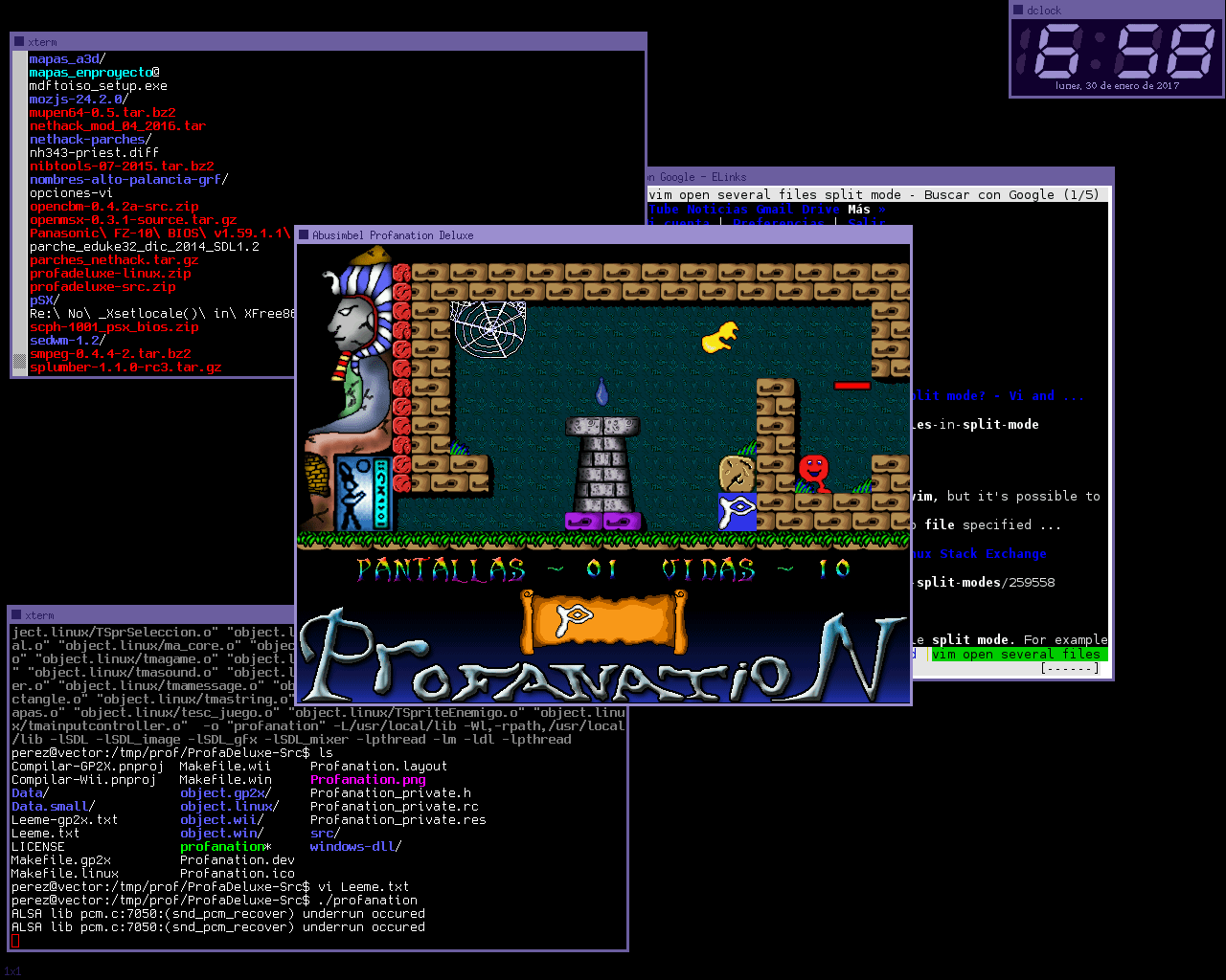He pasado con él más tiempo del que esperaba, más de tres semanas. Y sí, SedWM es un gestor de ventanas sobrio, rudimentario, con la funcionalidad mínima; un trabajo pensado para esos franciscanos de Unix que a una interfaz de escritorio sólo le piden que invoque Xterms. Como a estas alturas de la vida yo encajo bastante en ese perfil me desenvolví felizmente con él. Reconozco no obstante que existen alternativas más confortables, incluso si lo único que uno busca es eso, ejecutar terminales.