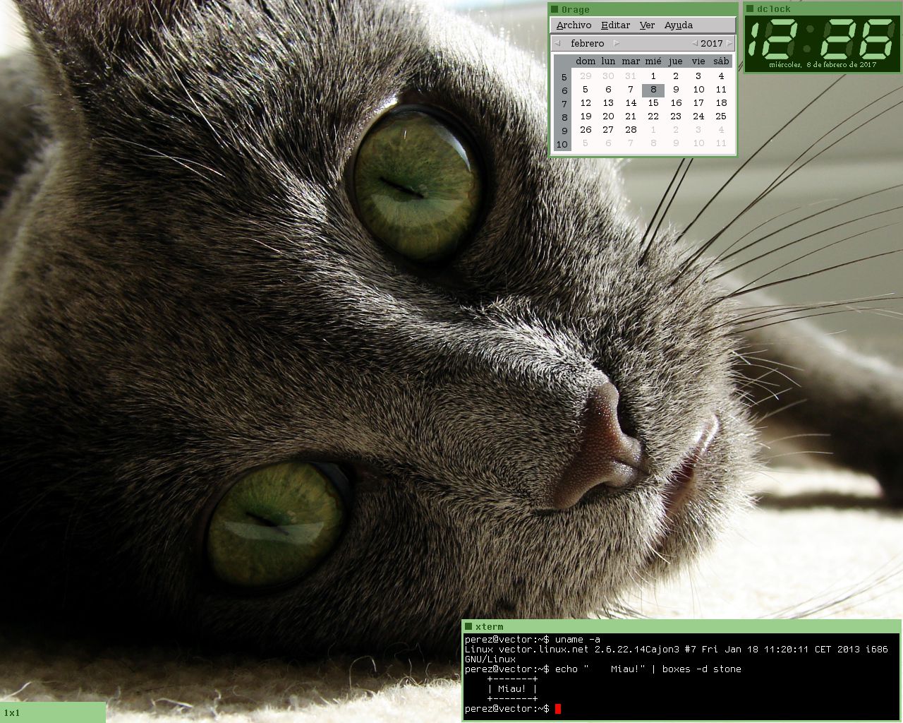 Mi copia modificada de SedWM: ya no existe el fondo negro, y el indicador de posición en el escritorio virtual aparece dentro de un rectángulo verde para que destaque sobre la foto del gatito. Elegí también una fuente más vistosa. |