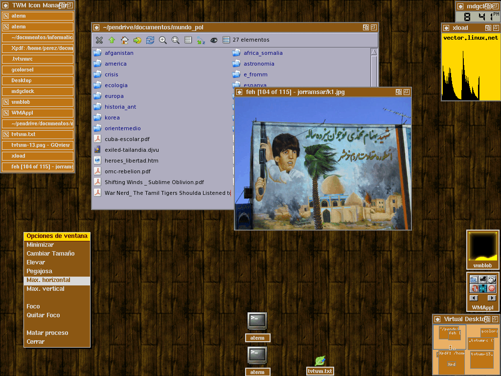 Twm + escritorio virtual + iconos en color = Tvtwm. Podría ser un entorno de trabajo muy recomendable, pero sus fallos —sobre todo su falta de estabilidad— terminan haciéndose enojosos. Si alguien se muere por usar un derivado de Twm en su ordenador, yo seguramente le recomendaría CTWM o Vtwm.
