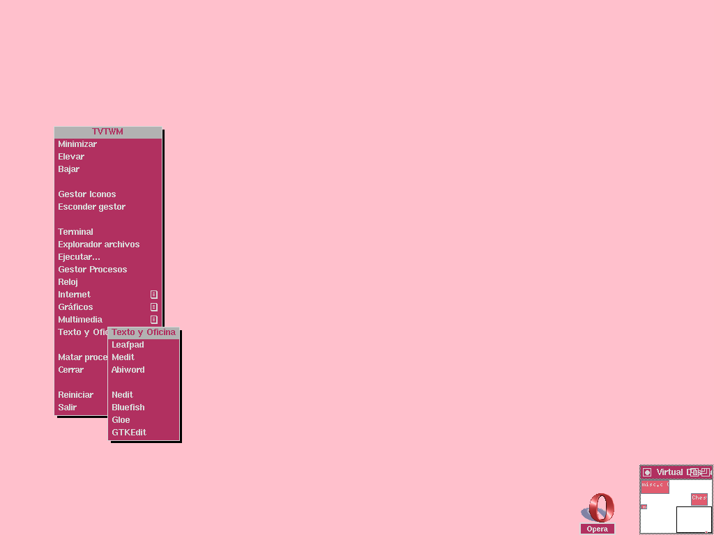 Ya, no resulta muy excitante, pero así comenzaron mis andanzas con Tvtwm. De izquierda a derecha: mi menú de aplicaciones, el icono de un programa minimizado —el navegador Opera—, y el imprescindible paginador, apodado aquí panner