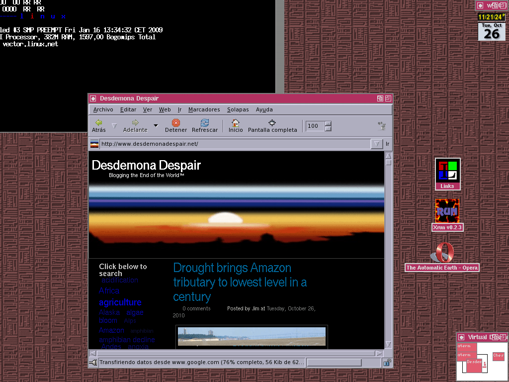 Los cuelgues ocasionales de Tvtwm son una pena, porque en general me pareció un gestor de ventanas realmente confortable. Posee toda la flexibilidad de Twm y subsana algunas de sus carencias más importantes. Y respecto al escritorio virtual... A mí me gusta, puede que incluso más que la idea de escritorios virtuales como entornos de trabajo separados, que suele ser más habitual hoy en día. Lo encuentro simple e intuitivo.