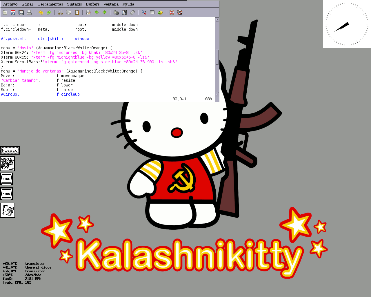 La configuración resulta bastante sencilla, y en media hora o así me preparé algo relativamente confortable. El fichero ~/.uwmrc es corto, no hay mucho que toquetear en él. Me pareció interesante comprobar que posee una sintaxis similar a la del archivo de preferencias de Twm. Considerando que dicho gestor fue una especie de descendiente evolucionado de Uwm hay poco de qué sorprenderse.