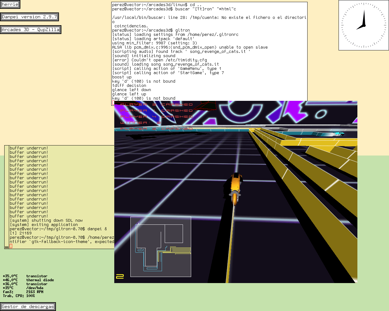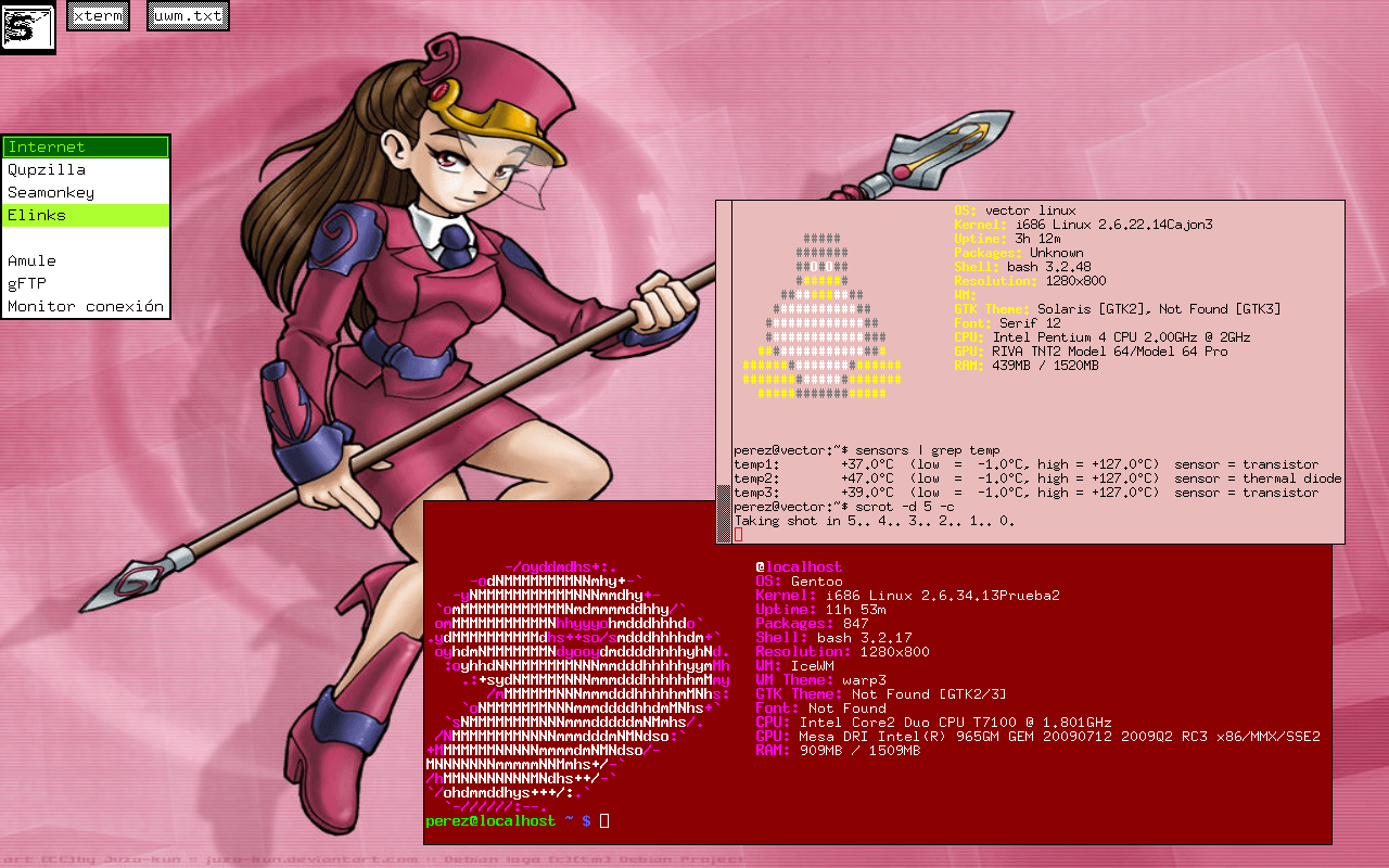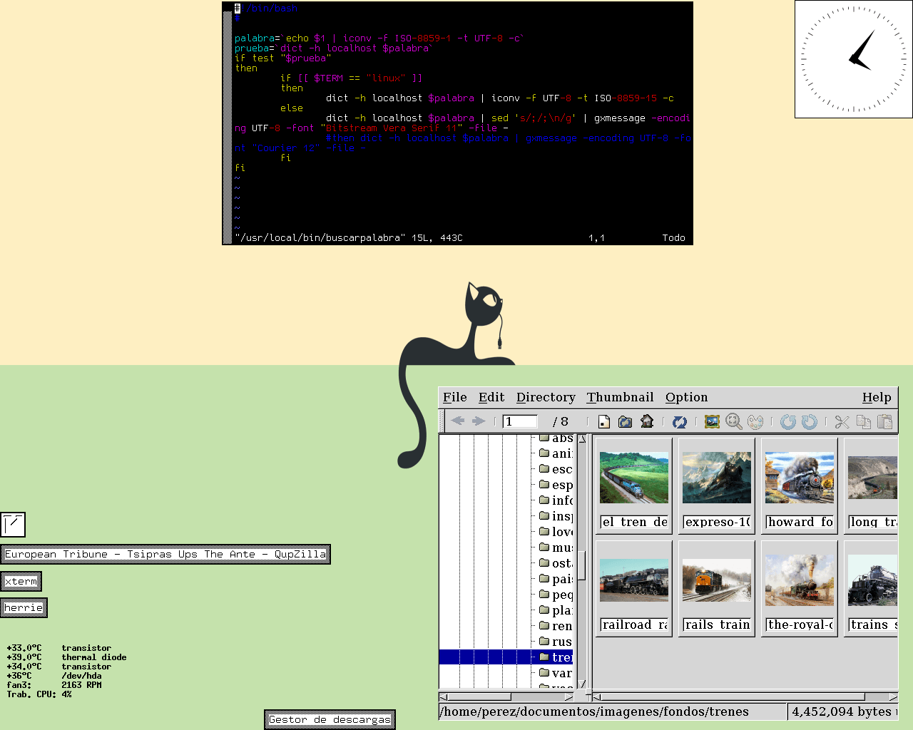 Un fondo de escritorio diferente. Abajo, a la derecha, Danpei muestra algunas imágenes. Repartidos a la izquierda y en el borde inferior hay algunas ventanas reducidas a iconos.