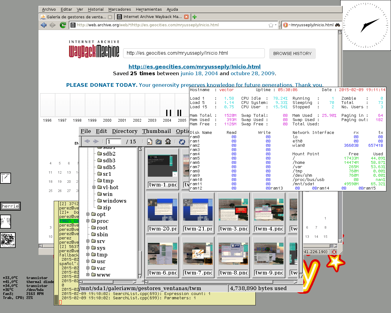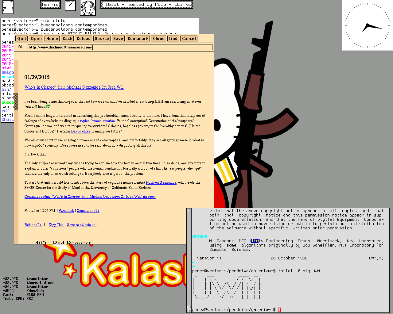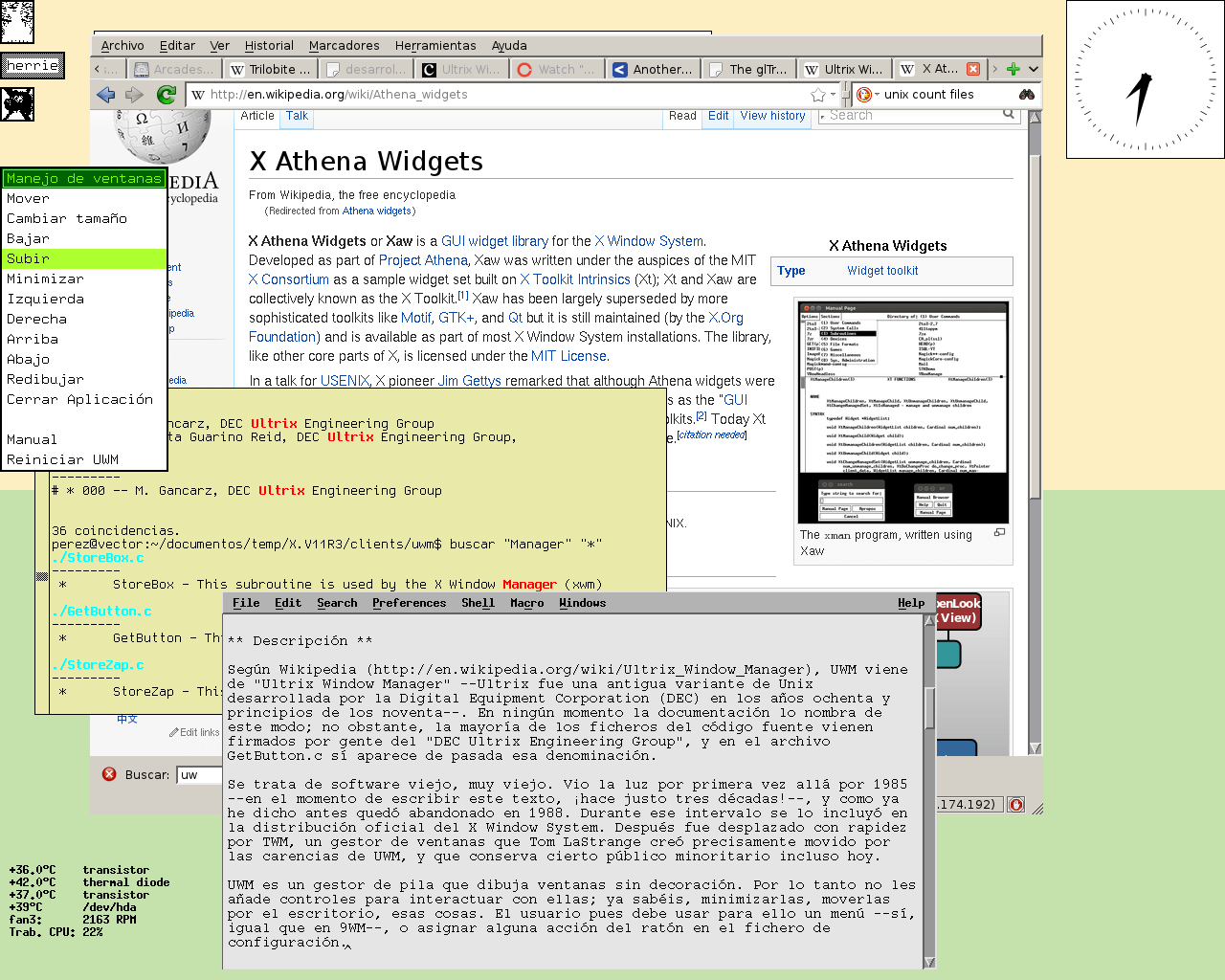 Uwm es el gestor de ventanas más antiguo que he probado, y se nota, vaya si se nota. Arcaico y rudimentario como un hacha de sílex... Sin embargo, que aún resulte posible compilarlo —aunque recurriendo a herramientas anticuadas— y utilizarlo en 2015 es ya un pequeño milagro, que hace contemple con un nuevo respeto al X Window System: ¡treinta años de compatibilidad hacia atrás!
