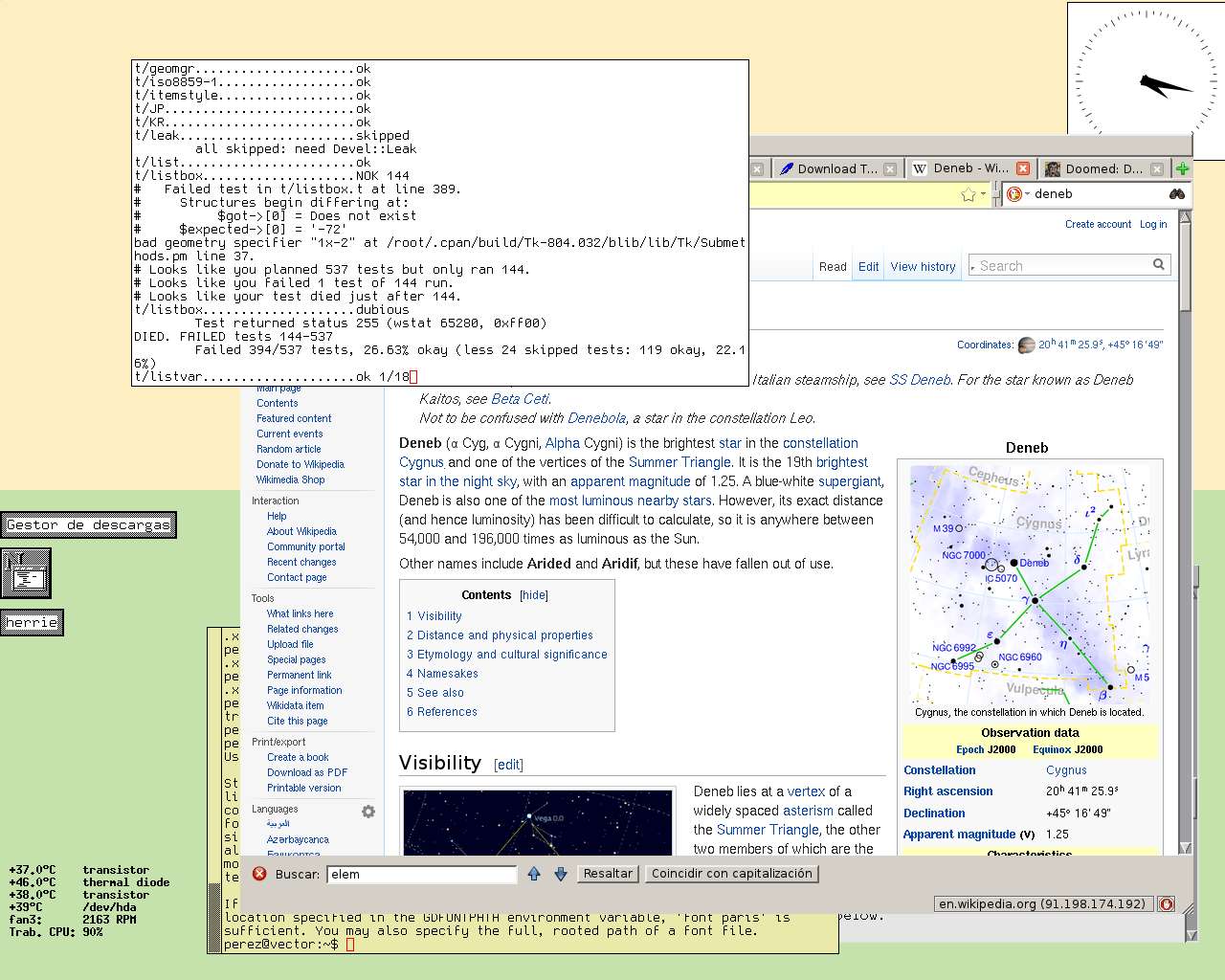 Bien, la ausencia de decoración en las ventanas implica que éstas deben ser controladas mediante el menú correspondiente —incómodo—, o combinaciones de teclado y ratón. Me llevó mi tiempo encontrar un sistema que me contentase, y aun así reconozco que no he llegado a sentirme realmente a gusto. Para ilustrarlo: clicar con el botón central del ratón sobre el fondo del escritorio para alterar el orden de la pila se me antoja una solución chapucera, pero es la menos mala que se me ocurrió para desenterrar ventanas ocultas, porque Uwm carece de menú de tareas.