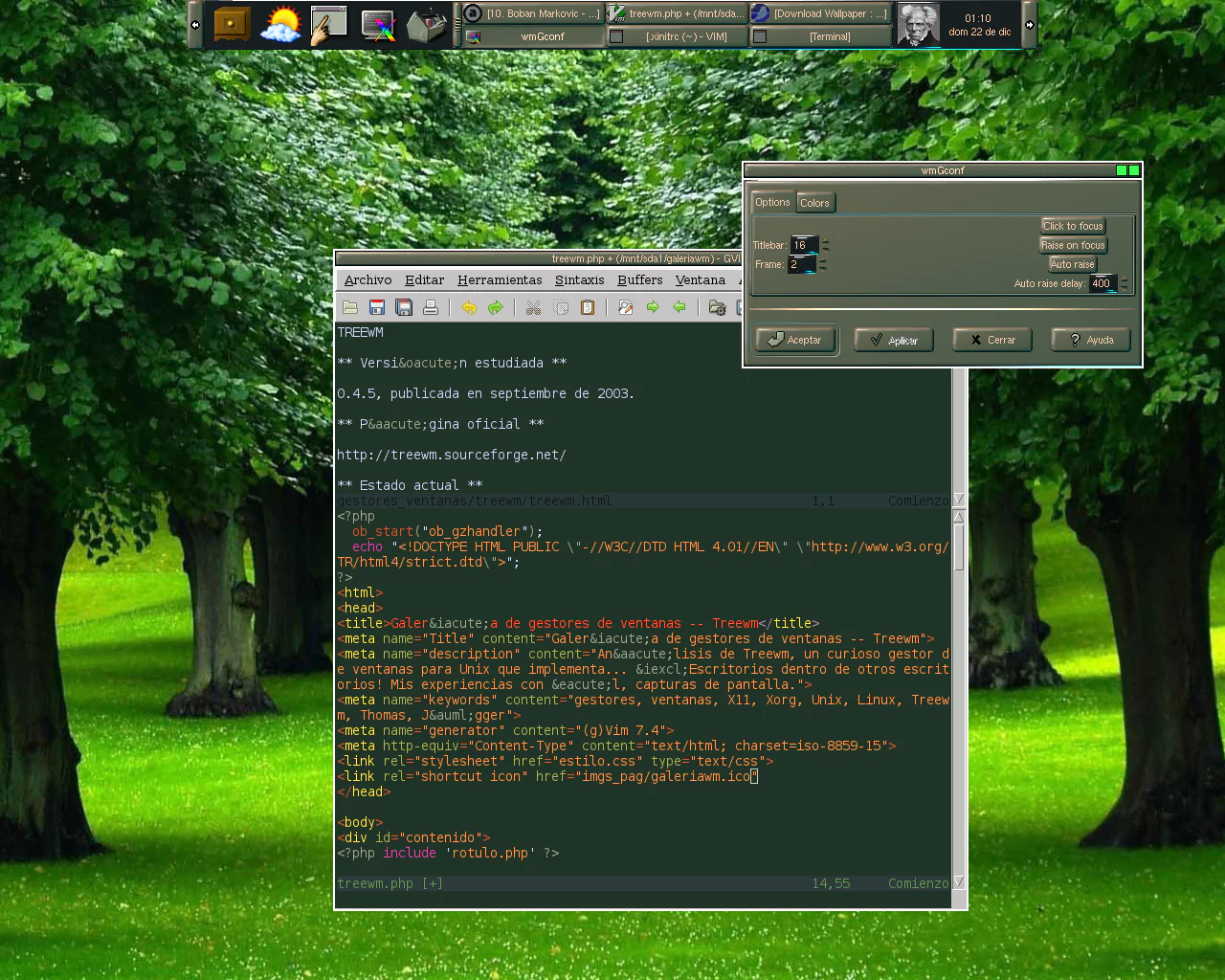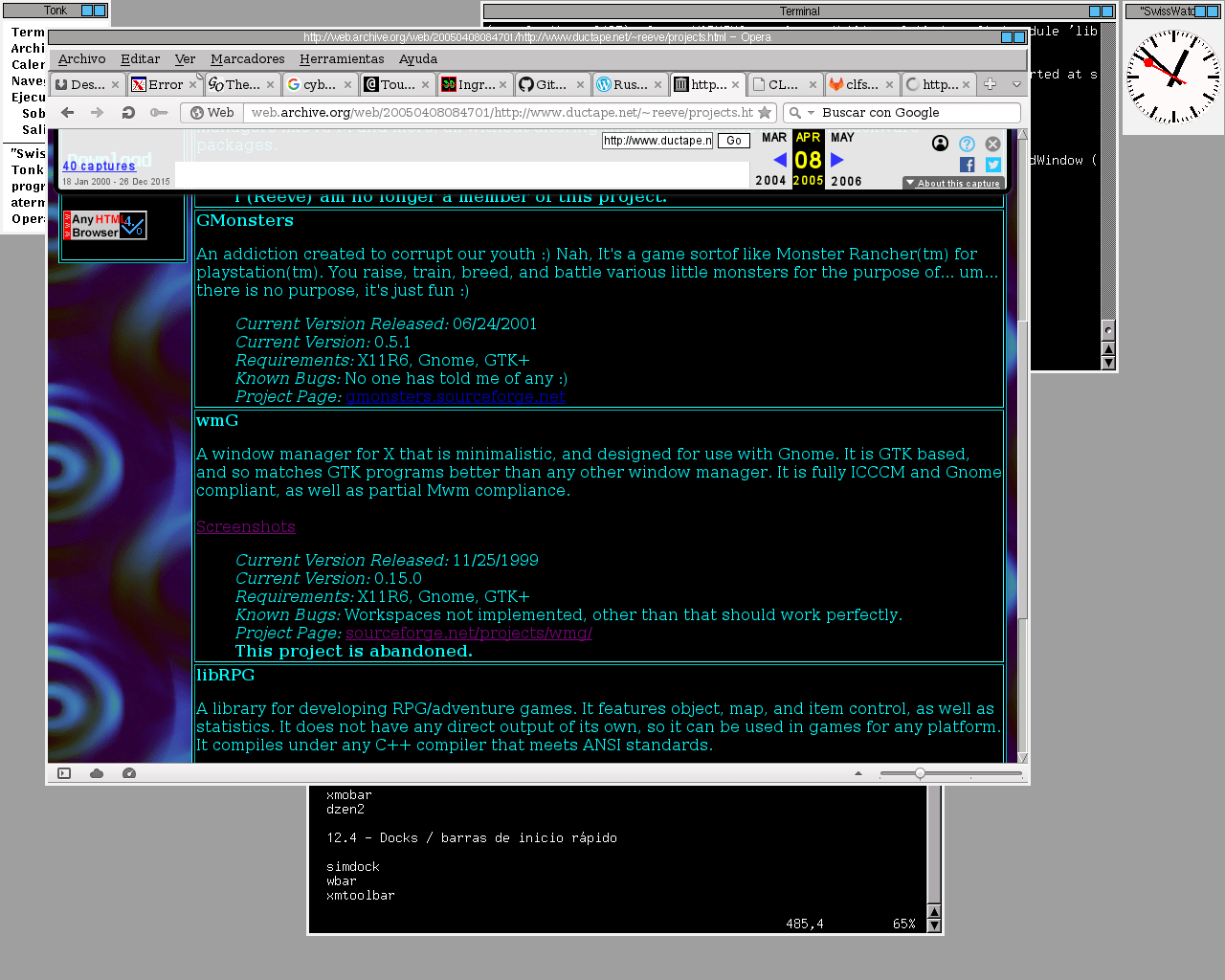 Empecé a usar wmG sin ningún panel, lo cual es poco recomendable porque no hay modo de restaurar ventanas minimizadas. Recurrí al principio para eso a Tonk —esquina superior izquierda—, una especie de gestor de iconos al estilo de Twm. En primer plano, la antigua página web del autor del proyecto