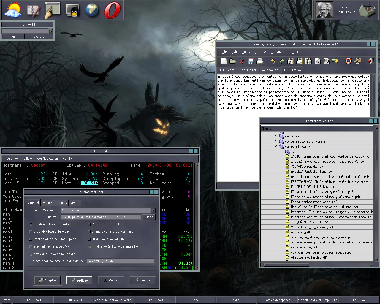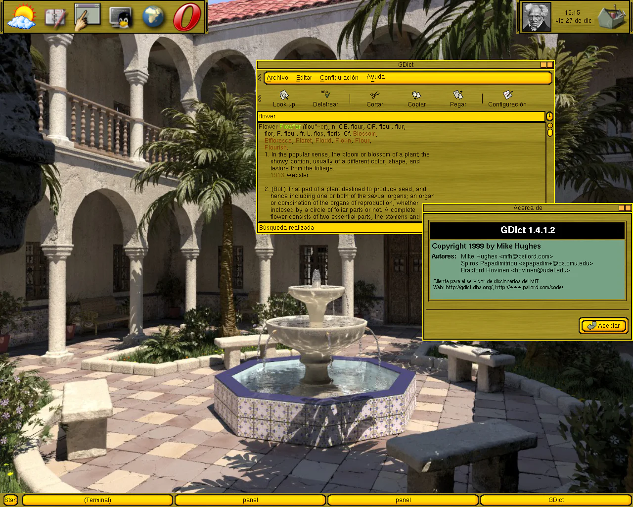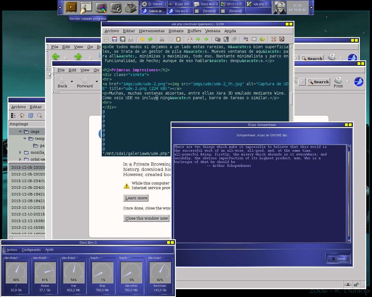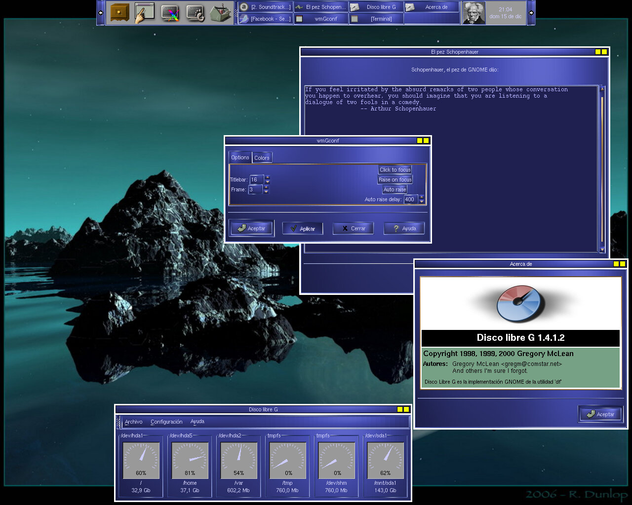Una estética diferente basada en el tema de GTK1 «Ganymede», muy del gusto de los primeros años 2000. El panel de Gnome está arriba y facilita mucho el trabajo con wmG; por cierto, a dicho panel se le podía agregar una mascota que dijera cosas, y yo naturalmente escogí a Schopenhauer. También son visibles otros accesorios antiguos de Gnome.