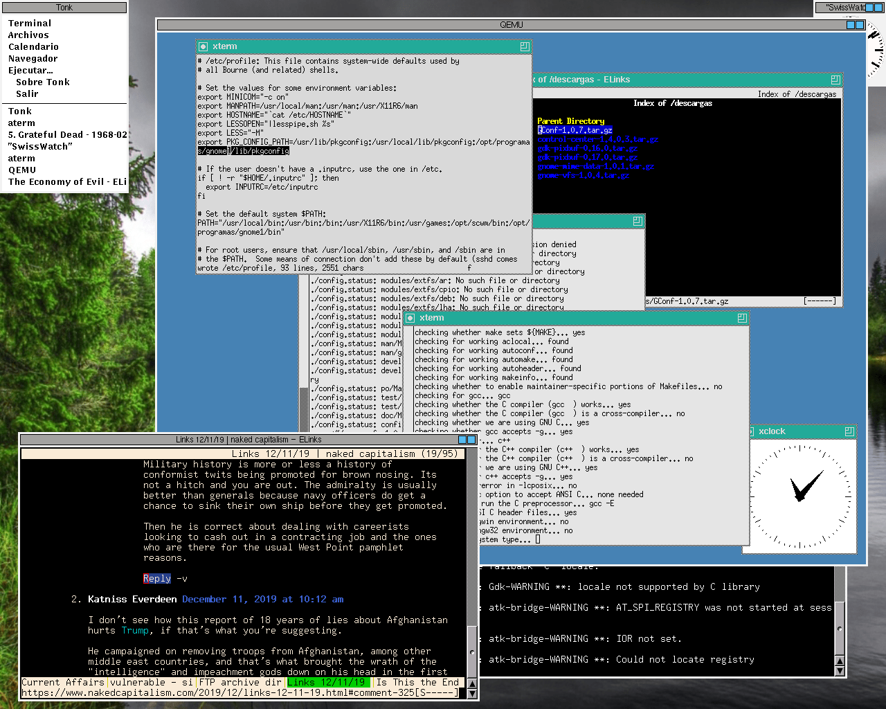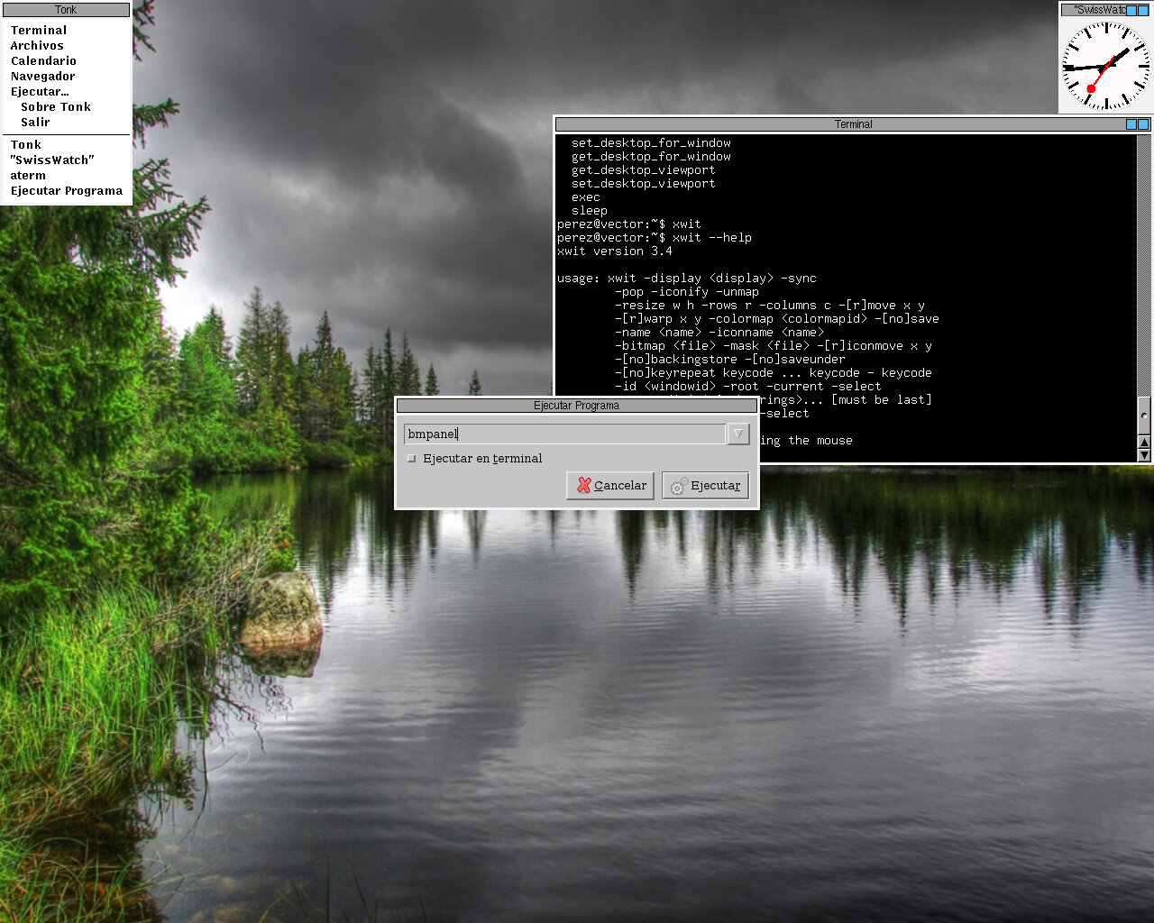 Bueno, la suma de wmG, Tonk —para restaurar ventanas minimizadas y ejecutar cosas— y un reloj, da como resultado un entorno de trabajo muy austero y un tanto tosco. Parece que podré sobrevivir así, aunque no resulte exactamente cómodo.