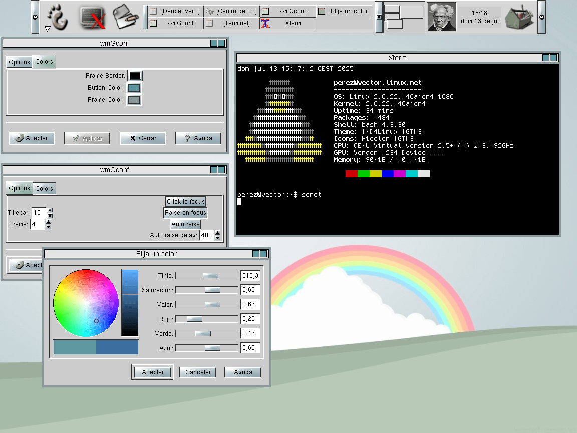 , descargué con paciencia las piezas necesarias de Gnome 1, y con más paciencia todavía las fui instalando bajo el directorio /opt/programas/gnome1 del sistema emulado. Y cuando ya lo tuve todo preparado, copié todo el conjunto —wmG, el panel y algunos accesorios de Gnome 1, las bibliotecas imprescindibles— a mi Linux habitual.