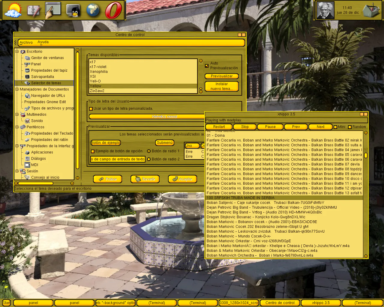 Este otro tema de GTK se llama «Yellow» y es tan suave y sutil como una sirena de fábrica. Como experimento, prescindí de la barra de tareas de Gnome y usé en su lugar el panel que incluía Aewm —borde inferior, basado también en GTK—. |