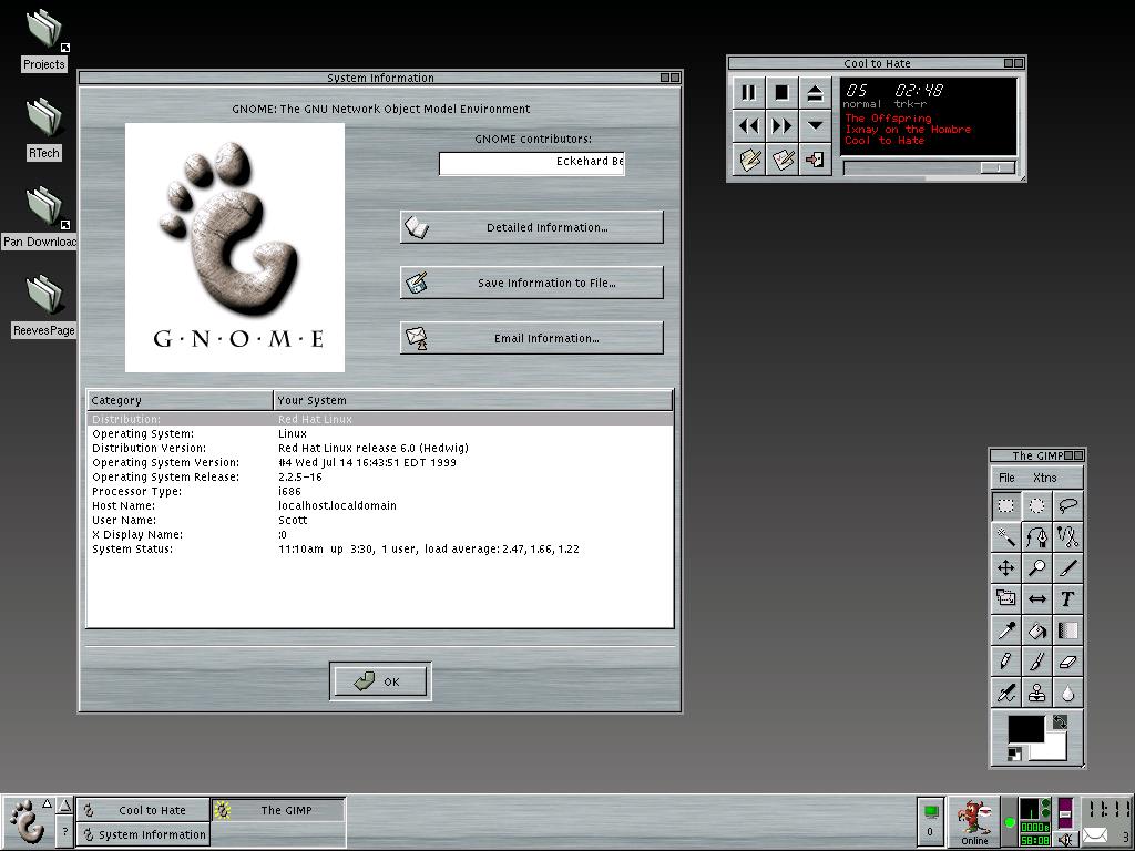 Exacto, Gnome... Pero, como hemos retrocedido a 1999, las versiones imperantes de este entorno de escritorio eran las de la primera rama —Gnome 1.x—, que apenas tienen nada que ver con las actuales. Y empleaban como gestor de ventanas a Sawfish. Ahora bien, Sawfish es bastante complejo, y relativamente pesado y poco amigable para un usuario sin experiencia; y probablemente eso movió a Barnes a escribir wmG.